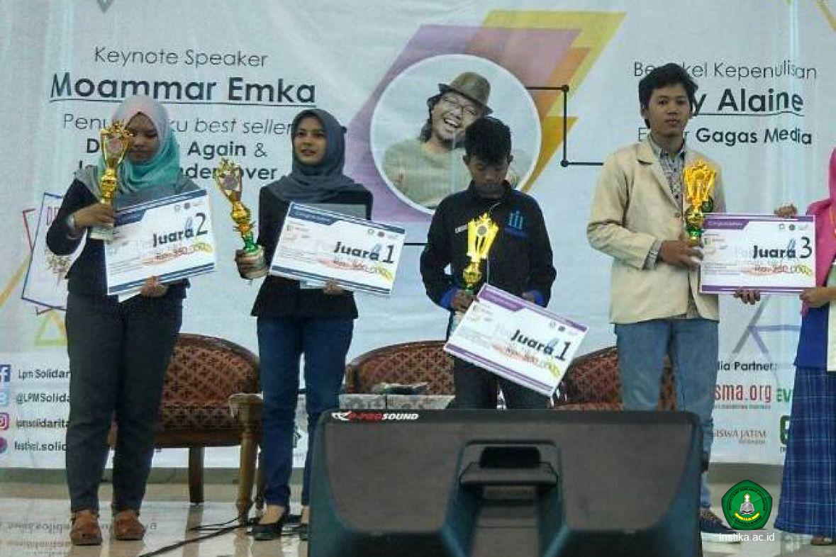 Surabaya - Instika - Ahmad Falhan Hafifi, mahasiswa prodi Ekonomi Syariah (ES) Fakultas Ekonomi dan Bisnis Islam (Febi) Instika meraih juara 3 Lomba Cerpen Nasional (LCN) yang diadakan Lembaga Pers Mahasiswa (LPM) SOLIDARITAS UIN Sunan Ampel Surabaya dalam rangka Festival Jurnalistik 2017, Kamis (4/5/2017).