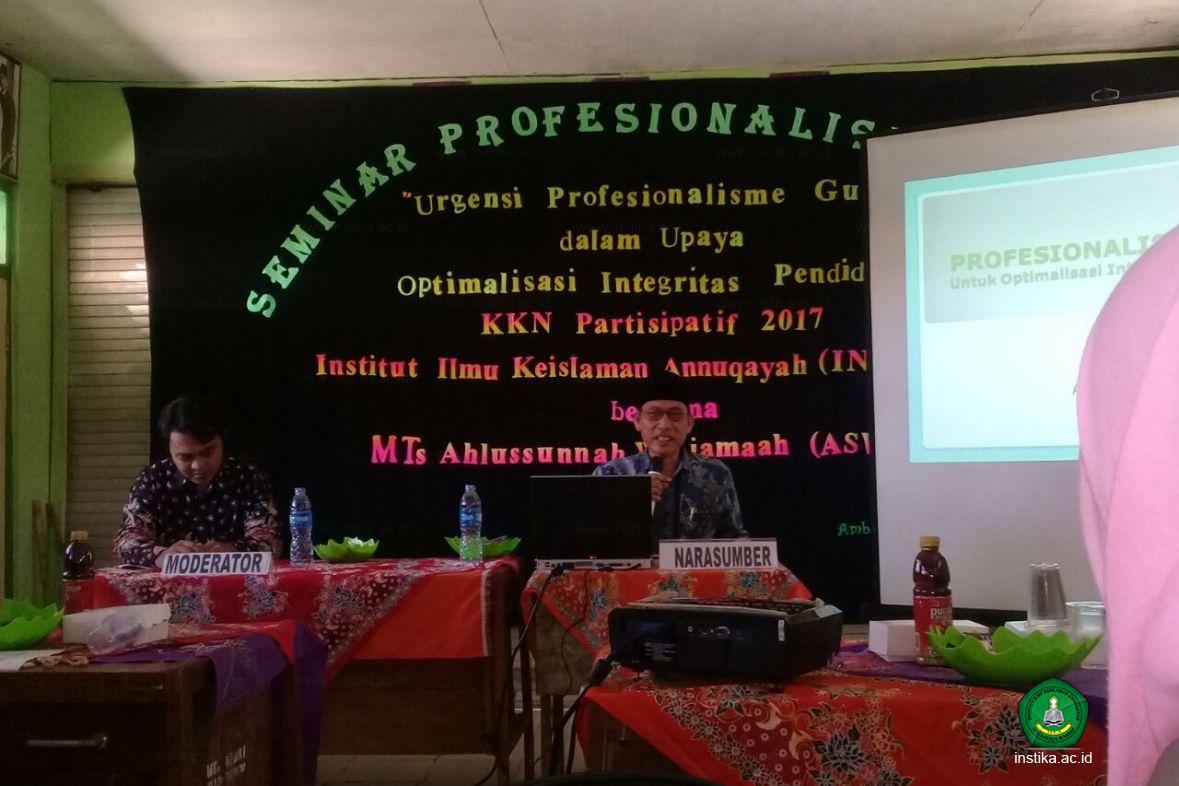AMBUNTEN, Selasa (08/08), mahasiswa Kuliah Kerja Nyata (KKN) Partisipatif INSTIKA 2017 Posko XLII Ambunten Timur Kecamatan Ambunten menggelar acara seminar profesionalisme guru dengan tema “Urgensi Profesionalisme Guru dalam Upaya Optimalisasi Integritas Pendidikan” yang bekerjasama dengan Madrasah Ahlussunnah Waljamaah (ASWAJ). Seminar tersebut dilaksanakan di Madrasah Tsanawiyah Ahlussunnah Waljamaah tepatnya di ruang kelas VII B dan VII C dengan melibatkan perwakilan dari 13 Lembaga Madrasah Ibtidaiyah se Kecamatan Ambunten, 10 Lembaga Madrasah Tsanawiyah se Kecamatan Ambunten, dan 3 dari perwakilan Madrasah Aliyah se Ambunten. Yang kesemuanya berjumlah 23 lembaga yang ikut berpartisipasi dalam acara seminar profesionalisme guru tersebut. Sedangkan seluruh lembaga pendidikan yang berada di bawah naungan yayasan Ahlussunnah Waljamaah adalah selaku tuan rumah dalam acara ini.