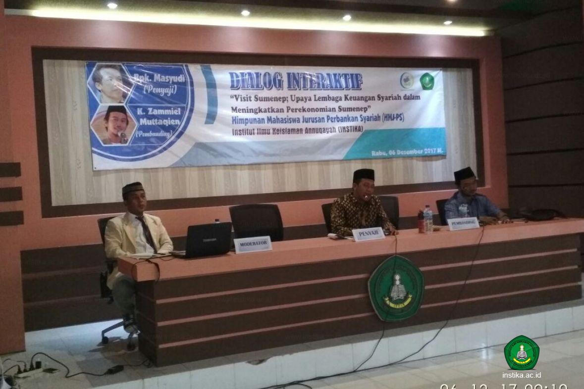 Guluk-guluk - Instika - Dalam rangka membicarakan peran Lembaga Keuangan Syariah (LKS) guna menyambut Visit Sumenep 2018, Himpunan Mahasiswa Jurusan Perbankan Syariah (HMJ-PS) Fakultas Ekonomi dan Bisnis Islam (FEBI) Instika menggelar Dialog Interaktif dengan tema ‘Visit Sumenep; Upaya Lembaga Keuangan Syariah dalam Meningkatkan Perekonomian Sumenep’, Rabu (6/12/2017) di Aula Mini Instika.