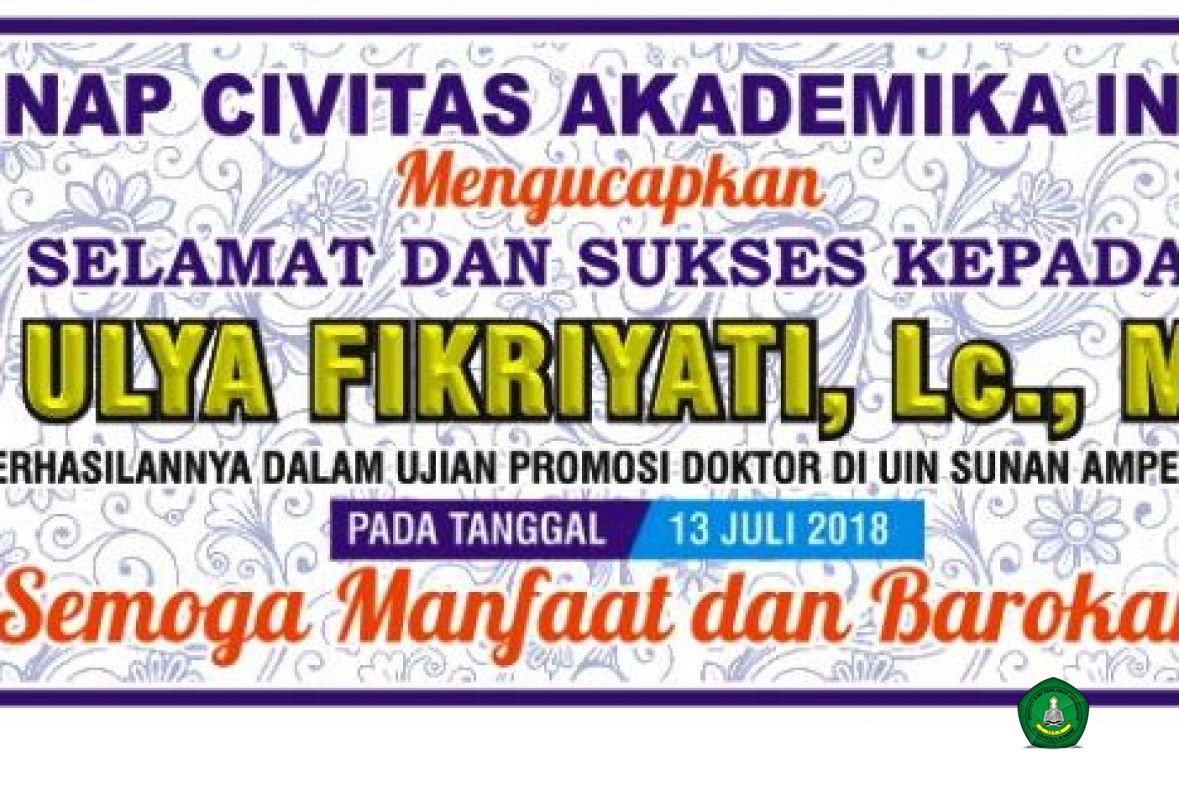 Disertasi yang dipertahankan Ulya dalam Sidang Terbuka itu berjudul ‘Interpretasi Ayat-Ayat “Pseudo Kekerasan” (Analisis Psikoterapis atas Karya-Karya Tafsir Hannản Lahhảm)’. Menurut kesaksian Dekan Fakultas Ushuluddin M Mushthafa MA yang hadir ke sidang itu, mengatakan bahwa Ulya Fikriyati dapat mempertahankan disertasinya di hadapan para penguji dengan sangat baik. “Ujian terbukanya keren, memperlihatkan kesungguhan dan kegigihan Bu Ulya untuk berjihad di bidang keilmuan,” ujar M Mushthafa.