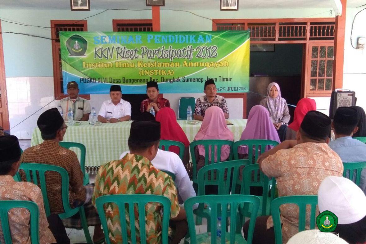 Dungkek – INSTIKA - Mahasiswa peserta Kuliah Kerja Nyata (KKN) Riset Partisipatif Institut Ilmu Keislaman Annuqayah (INSTIKA) 2018 Posko XLVI Desa Bunpenang Kecamatan Dungkek Kabupaten Sumenep menggelar Seminar, Rabu (25/7/2018), dengan tema, ‘Pernikahan Dini; antara Idealisme dan Tradisi’ di Balai Desa Bunpenang. Acara ini melibatkan Aparat Desa dan sepuluh orang perdusun di Bunpenang yang terdiri dari masyarakat, Tokoh Masyarakat dan Mudin.