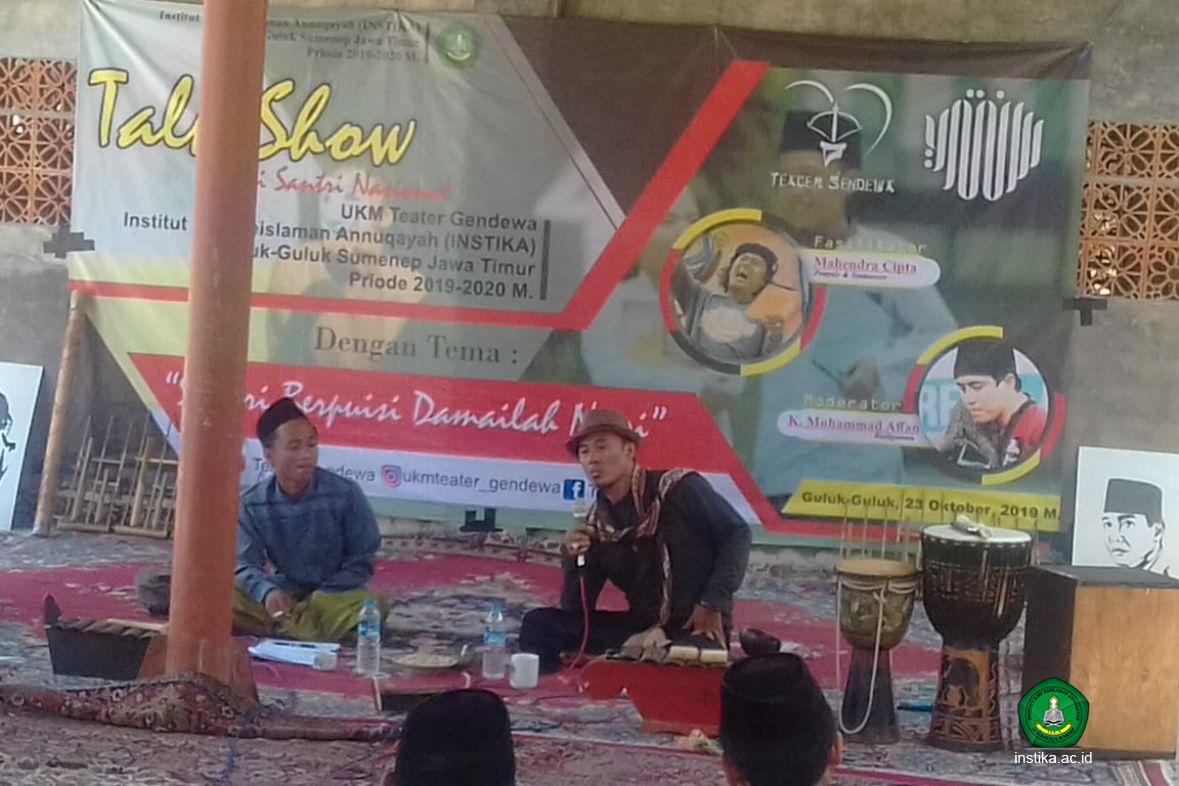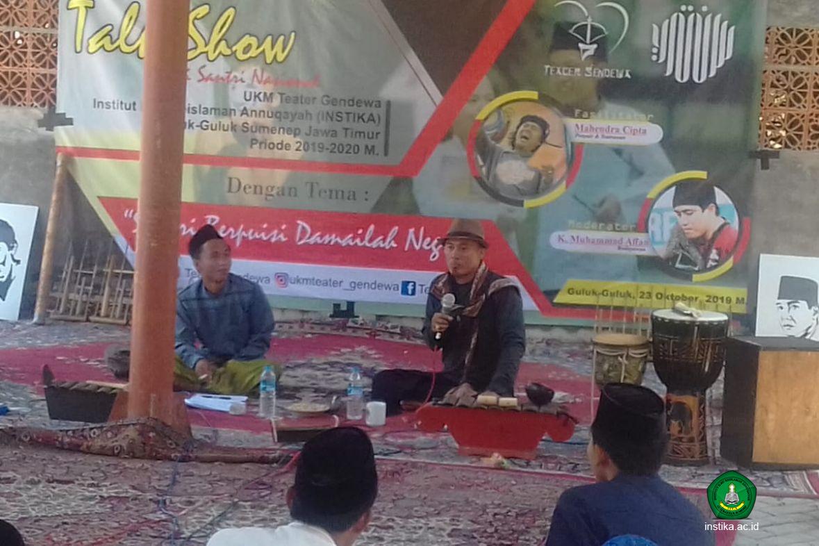 Guluk-Guluk - INSTIKA - UKM (Unit Kegiatan Mahasiswa) Gendewa Institut Ilmu Keislaman Annuqayah (INSTIKA) Guluk-Guluk Sumenep mengadakan refleksi Hari Santri Nasional (HSN) 2019 yang dikemas dalam bingkai Talk Show dengan tema “Santri Berpuisi Damailah Negeri” di halaman Kampus INSTIKA, Rabu (23/10/2019).