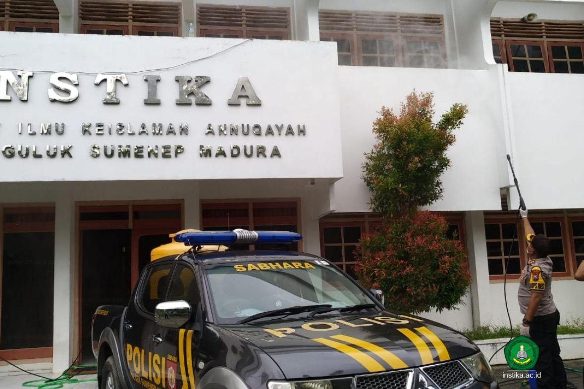 Guluk-Guluk - INSTIKA - Jajaran Polres Sumenep melakukan penyemprotan disinfektan di lingkungan Institut Ilmu Keislaman Annuqayah (INSTIKA) Guluk-Guluk Sumenep, Rabu (1/4/2020) sore.