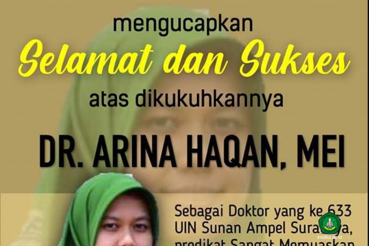 Rektor Drs KH Ah Syamli MPdI mewakili civitas akademika INSTIKA mengucapkan selamat dan sukses kepada Arina Haqan MEI atas keberhasilannya meraih gelar doktor di bidang ekonomi syariah.
