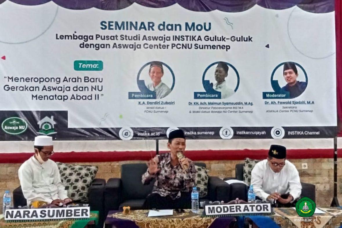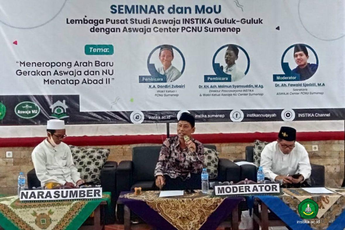 Guluk-Guluk - INSTIKA - Untuk memperkuat pemahaman keaswajaan di lingkungan kampus, Lembaga Pusat Studi Aswaja (LPSA) Institut Ilmu Keislaman Annuqayah (INSTIKA) Guluk-Guluk Sumenep, Ahad (21/3/2022), menggelar Seminar dan Penandatanganan Kerja Sama (MoU) dengan Aswaja Center PCNU Sumenep di Aula Assyarqawi.