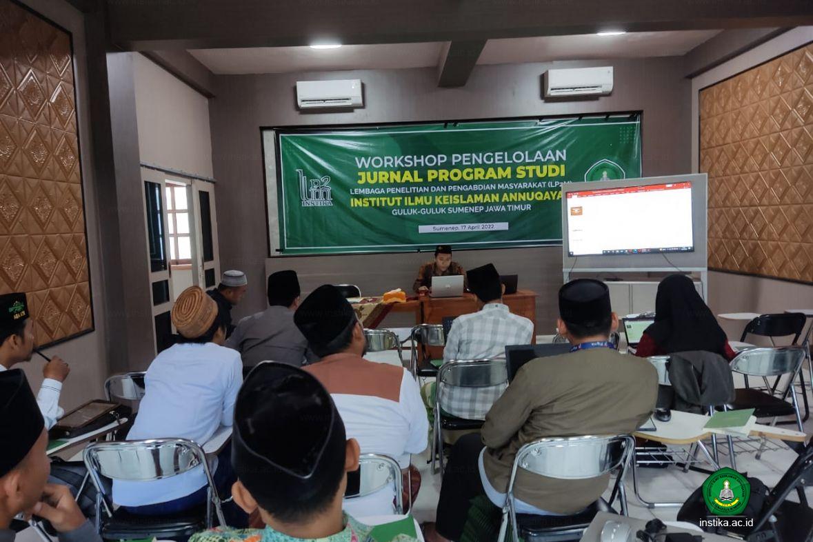 Guluk-Guluk - INSTIKA - Untuk memotivasi dan meningkatkan mutu penelitian dan publikasi ilmiah, khususnya dalam pengelolaan Jurnal Program Studi, Lembaga Penelitian dan Pengabdian Kepada Masyarakat (LP2M) Institut Ilmu Keislaman Annuqayah (INSTIKA) Guluk-Guluk Sumenep, Ahad-Senin (17-18/4/2022) menggelar Workshop Pengelolaan Jurnal Program Studi di Ruang Pertemuan Pascasarjana 2.