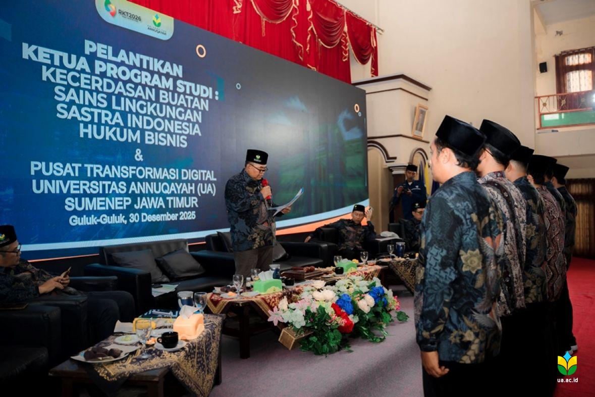 Sumenep, UA Media– Rektor Universitas Annuqayah, Guluk-Guluk, Sumenep, Madura secara resmi melantik Ketua Program Studi (Prodi) baru Sastra Indonesia, Hukum Bisnis, Sains Lingkungan, dan Kecerdasan Buatan (AI) dan Pusat Transformasi Digital di Aula As-Syarqawi, Selasa, 31 Desember 2025.